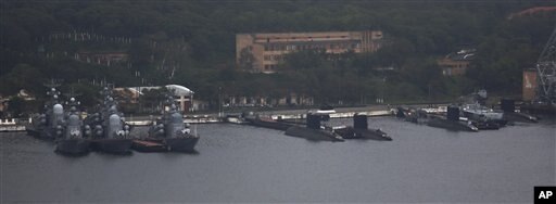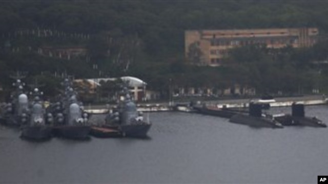 Russian naval warships, submarines berthed at port in the eastern city of Vladivostok, Sept. 5,